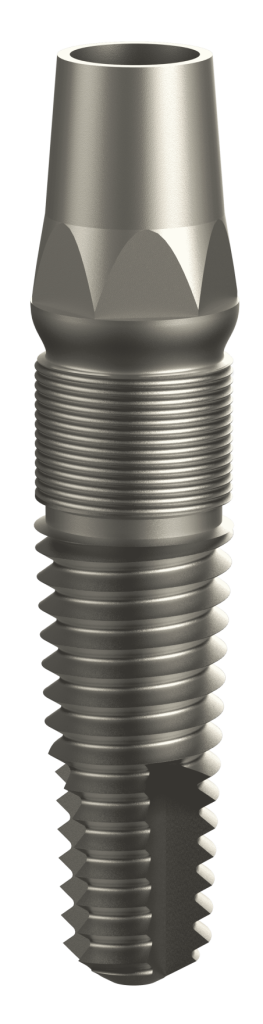 – Geometria conica e filettata: La forma conica con apice arrotondato riduce il trauma osseo, migliora la stabilità primaria e favorisce il carico immediato, adattandosi anche a creste sottili o atrofiche.